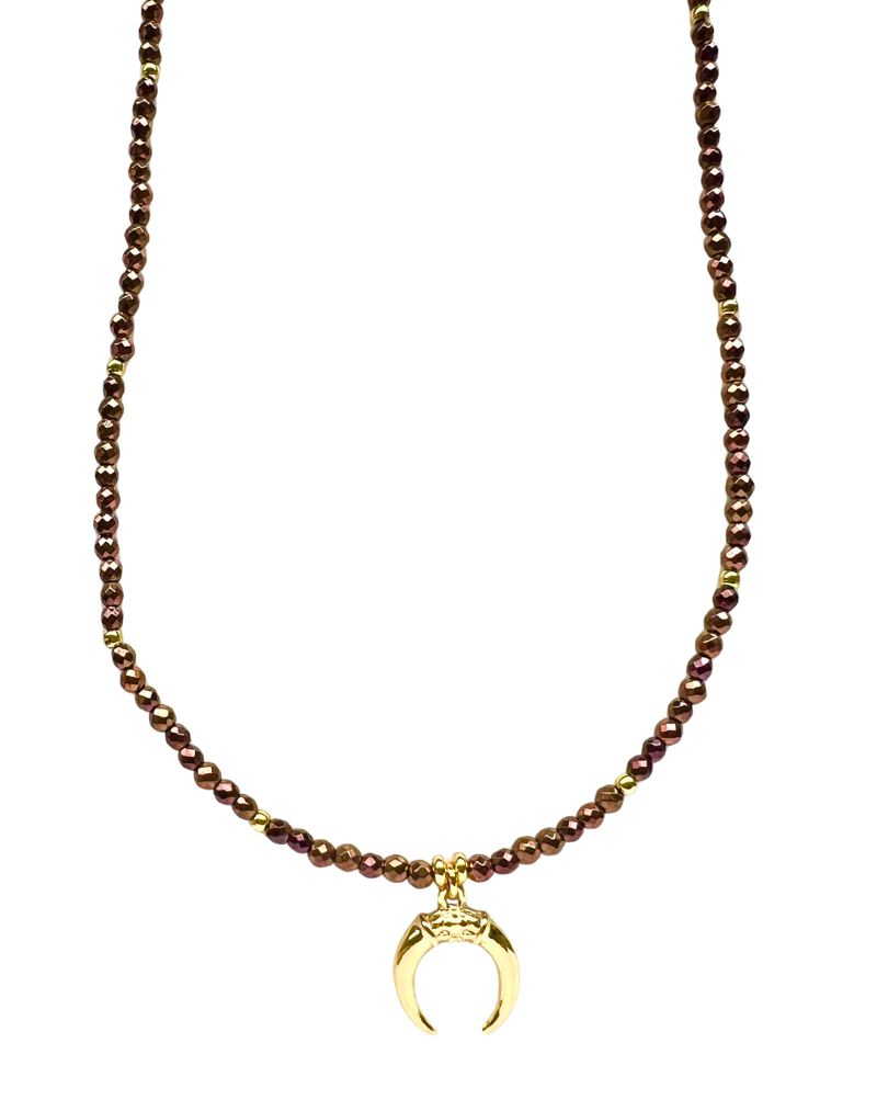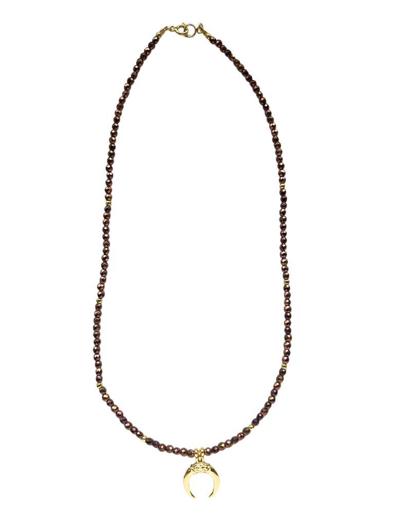 Najmodniejszy w tym sezonie naszyjnik w czekoladowym odcieiu z hematytów oraz z zawieszką z motywem rogów (księżyca).
